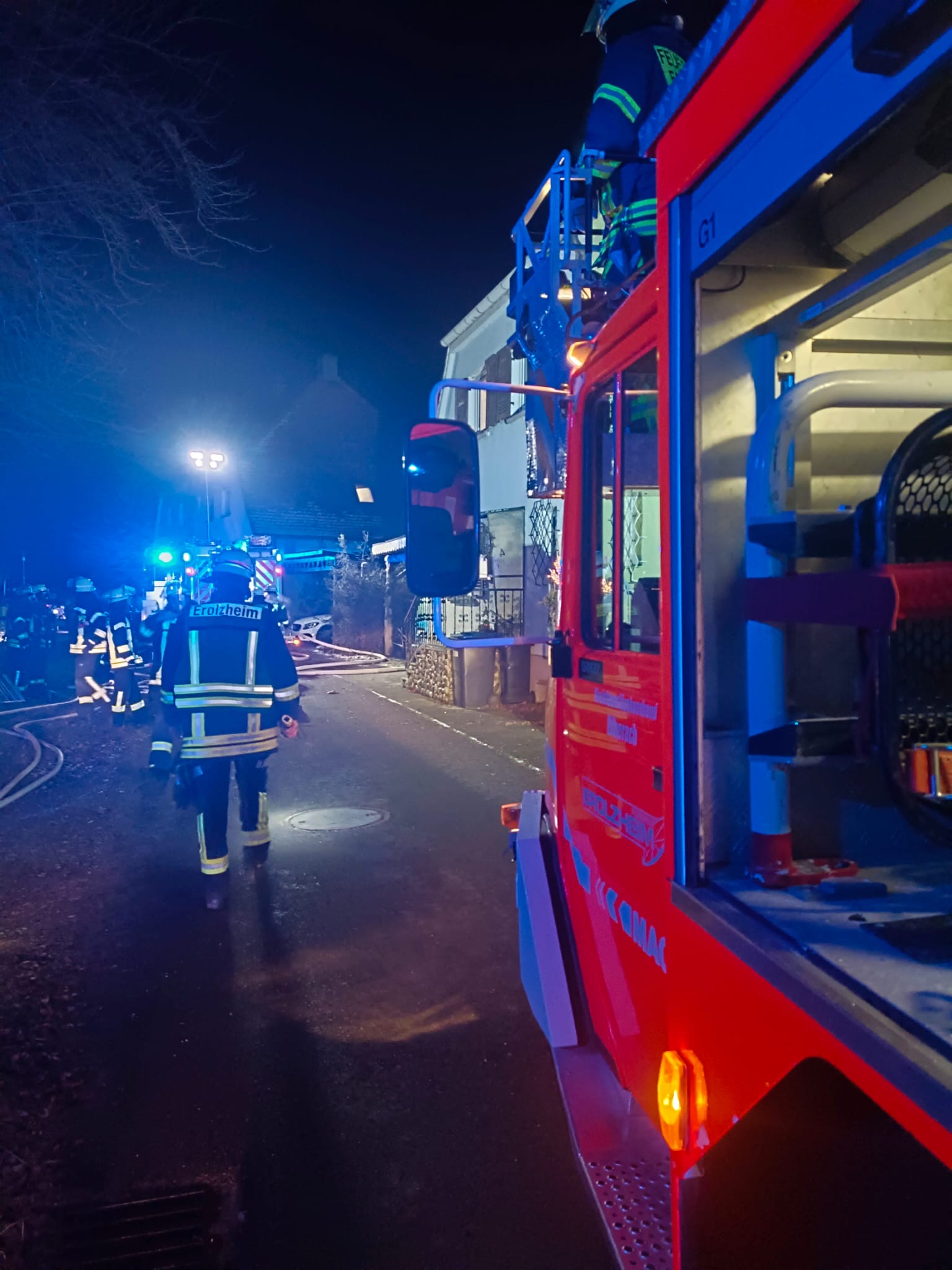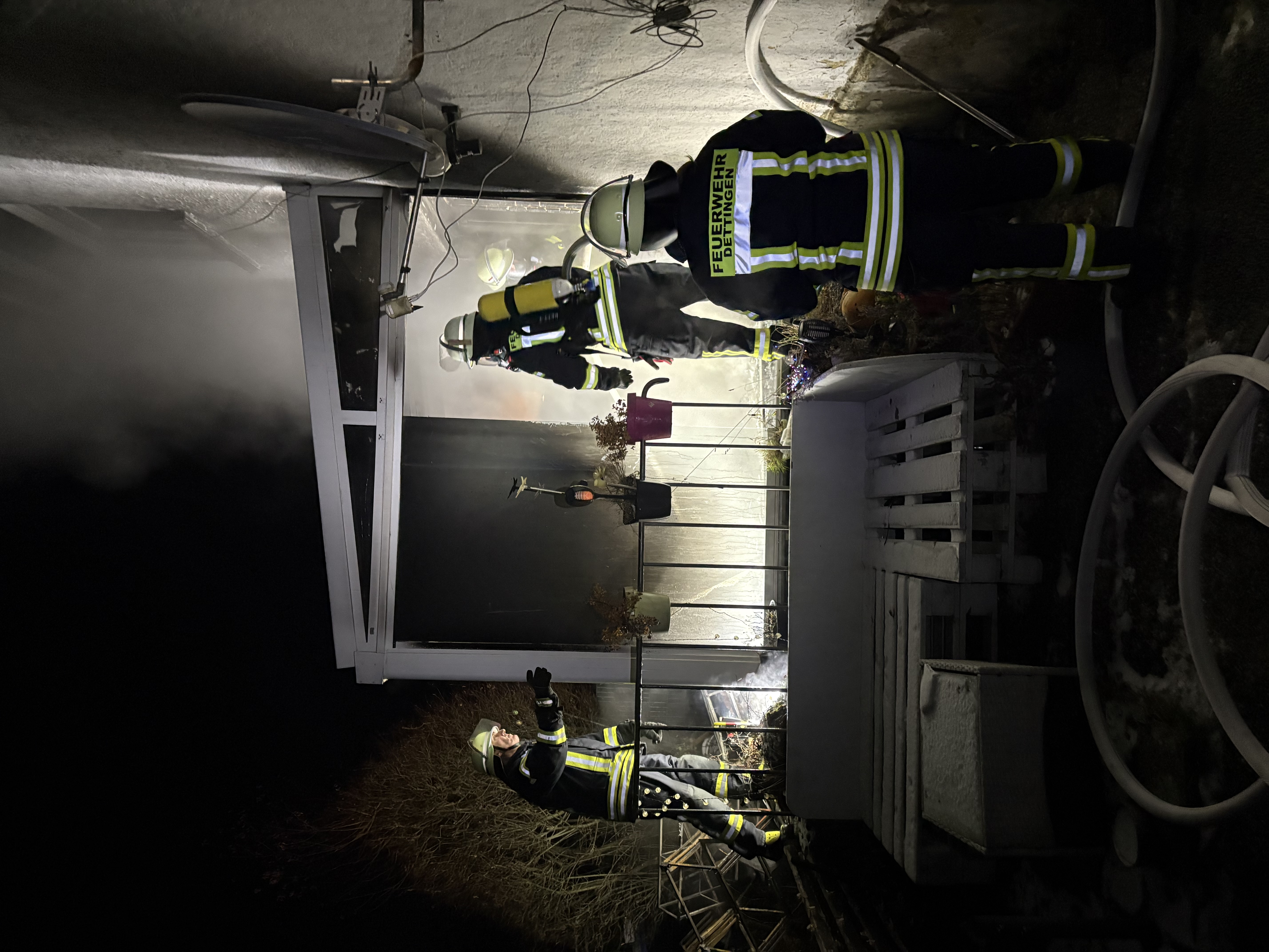 Erneut ging es für die Feuerwehr Erolzheim zu einem Brandeinsatz nach Dettingen. An einem Doppelhaus brannte ein angebauter Wintergarten in voller Ausdehnung. Die Feuerwehr Dettingen begann umgehend mit der Brandbekämpfung. Wir stellten für die Atemschutzgeräteträger einen Sicherheitstrupp. Außerdem wurde die Drehleiter in Stellung gebraucht. Nachdem das Feuer gelöscht war, wurde das Gebäude noch belüftet und mit der Wärmebildkamera kontrolliert.