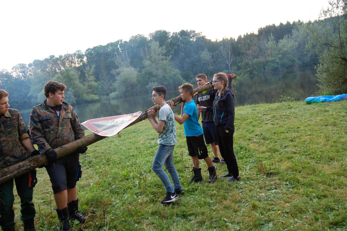 Da wir den Zeltplatz nicht im Voraus besichtigen konnten stellten wir fest, dass er bei unserer Ankunft sehr verwachsen, um nicht zu sagen verwuchert war. Es begann eine regelrechte Odyssee im näheren Umfeld von Konradsweiler auf der Suche nach einer Sense oder einem anderen Gerät um dem Urwald zu Leibe zu rücken. Nach ungefähr 3 Stunden suche wurden wir dann endlich in Hauerz fündig. An dieser Stelle ein recht herzliches Vergelt´s Gott an die Familie Mang für die freundliche Hilfe. Nun konnten endlich die Zelte aufgebaut, das Feuer entzündet und die Wimpel Stange gestellt werden. Dass Lager war bereit für die Nacht!
