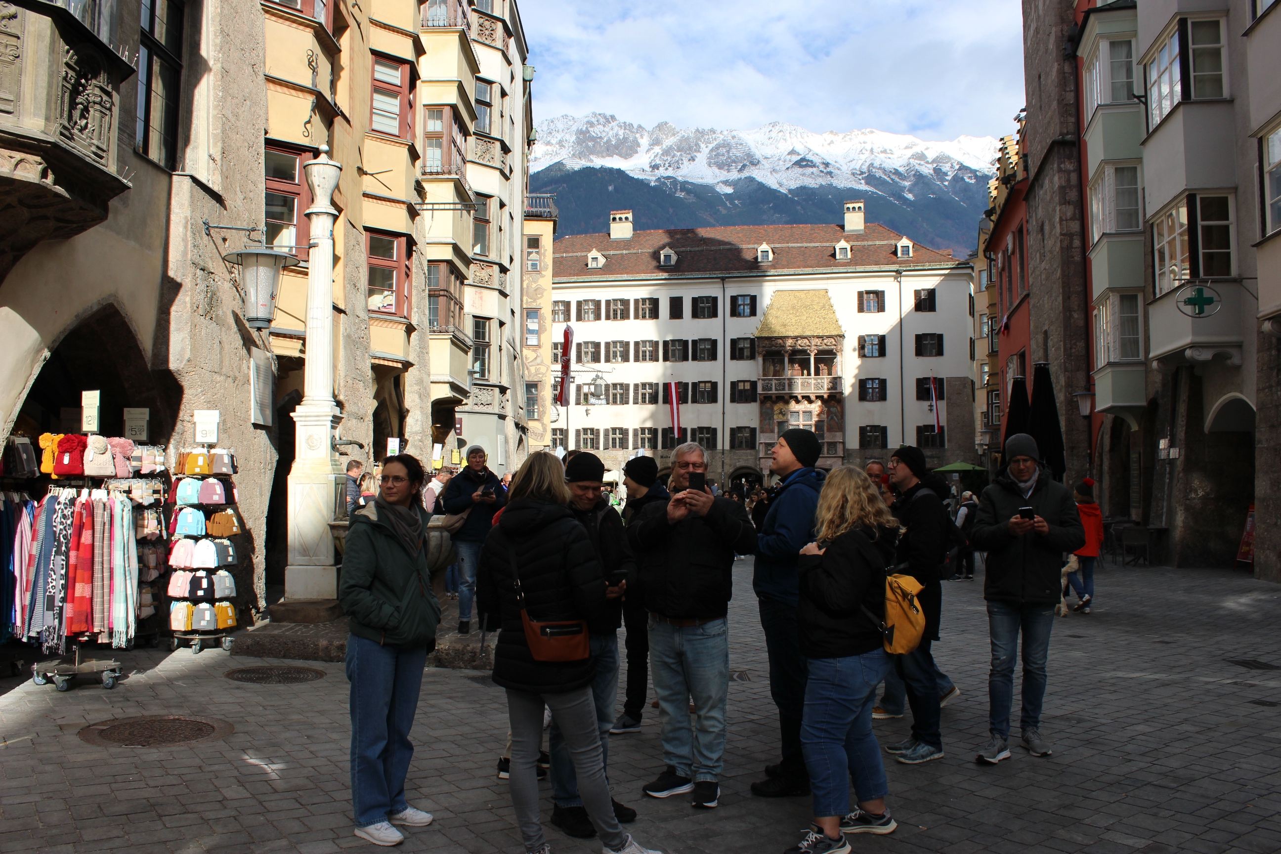 Am Samstag stand nach dem Frühstück eine Stadtführung auf dem Programm. Hierzu wurden wir von unserem Bus in der Innenstadt abgesetzt, wo auch schon unsere zwei Stadtführerinnen warteten. Aufgeteilt in 2 Gruppen, ging es zuerst in einer 1,5 stündigen Führung durch die Innenstadt, wo wir viel über die Geschichte der Stadt erfuhren und an vielen bekannten Bauwerken vorbei kamen, wie das goldene Dachl, den Stadtturm oder am Dom. Eindrucksvoll war auch die schöne Lage der Stadt im Inntal mit dem Bergpanorama der Nordkette, hier fiel einen Tag vor unserer Ankunft der erste Neuschnee. Gegen 12 Uhr trafen dann beide Gruppen wieder am Marktplatz ein, dort wurden wir von unserem Bus wieder abgeholt und es ging weiter zur Skiflugschanze Bergisel. Im zweiten Teil unserer Stadtführung wurde uns hier viel über die Geschichte der Skisprungstätte mit olympischer Vergangenheit erläutert. So sah man auch, damit die Skispringer vom Zitterbalken aus direkt einen Blick auf den Friedhof von Innsbruck haben, welcher unterhalb der Schanze liegt. Außerdem hatten wir das Glück, dass 2 Skispringer gerade ihre Trainingssprünge auf der Mattenschanze absolvierten und wir hierbei noch zuschauen konnten. Nachdem die Führungen beendet waren, ging das Reiseprogramm gleich weiter zur Glockengießerei Grassmayr. Diese ist an ihrem Standort Innsbruck eine Kombination aus Glockengießerei, Glockenmuseum und Klangraum mit einer über 400 Jahre alten Geschichte. Hier wird aktuell eine über 14to schwere Glocke für den Magdeburger Dom hergestellt. Herr Grassmayr und seine Schwester führten uns persönlich durch das Museum und ihre Glockenwerkstatt. Hierbei erklärten sie uns voller Leidenschaft, wieviel Monate Arbeit und Arbeitsschritte es benötigt, bis eine Glocke hergestellt ist. Niemand von unserer Reisegruppe hätte es gedacht, damit die Herstellung von einer Glocke so eindrucksvoll sein kann. Auch berichtete Hr. Grassmayr, damit sie schon für über 100 Ländern Glocken gegossen haben und jedes Land ein unterschiedliches „läuten“ hat. Zum Abschluss führte er uns noch durch die Klangräume, wo auch jeder noch selbst die Schwingungen der Klänge fühlen konnte. Nach den sehr interessanten Eindrücken hatte im Anschluss jeder noch Zeit zur freien Verfügung, bevor es am Abend gemeinsam an den Baggersee zum Abendessen ging. Hier hatten wir im Restaurant deck47 reserviert, wo auch einige bei der Tiroler Spezialität „Törggelen“ mitmachten.