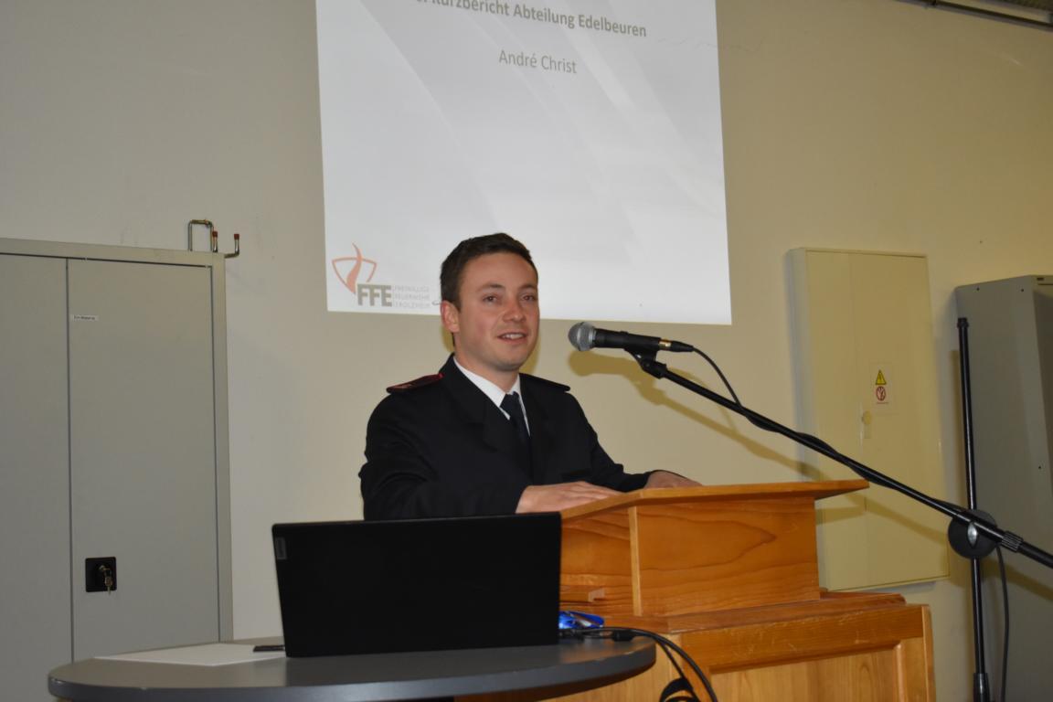 Abteilungskommandant Andre Christ konnte in seinem Bericht der Abteilung Edelbeuren durchweg positives berichten. Gerade im Bereich der Ausbildung waren die Kameraden der Abteilung im Jahr 2025 sehr fleißig haben sich in vielen Richtungen fortgebildet.