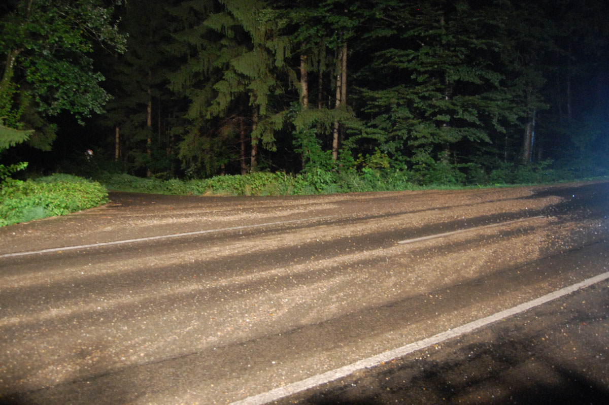 Ein starker Landregen schwemmte erneut Kies auf die Landesstraße zwischen Erolzheim und Edelbeuren. An dieser unübersichtlichen Stelle ist dies eine besondere Gefährdung für die Verkehrsteilnehmer. Mit Kräften vom vorangegangen Einsatz wurde die Straße gereinigt.