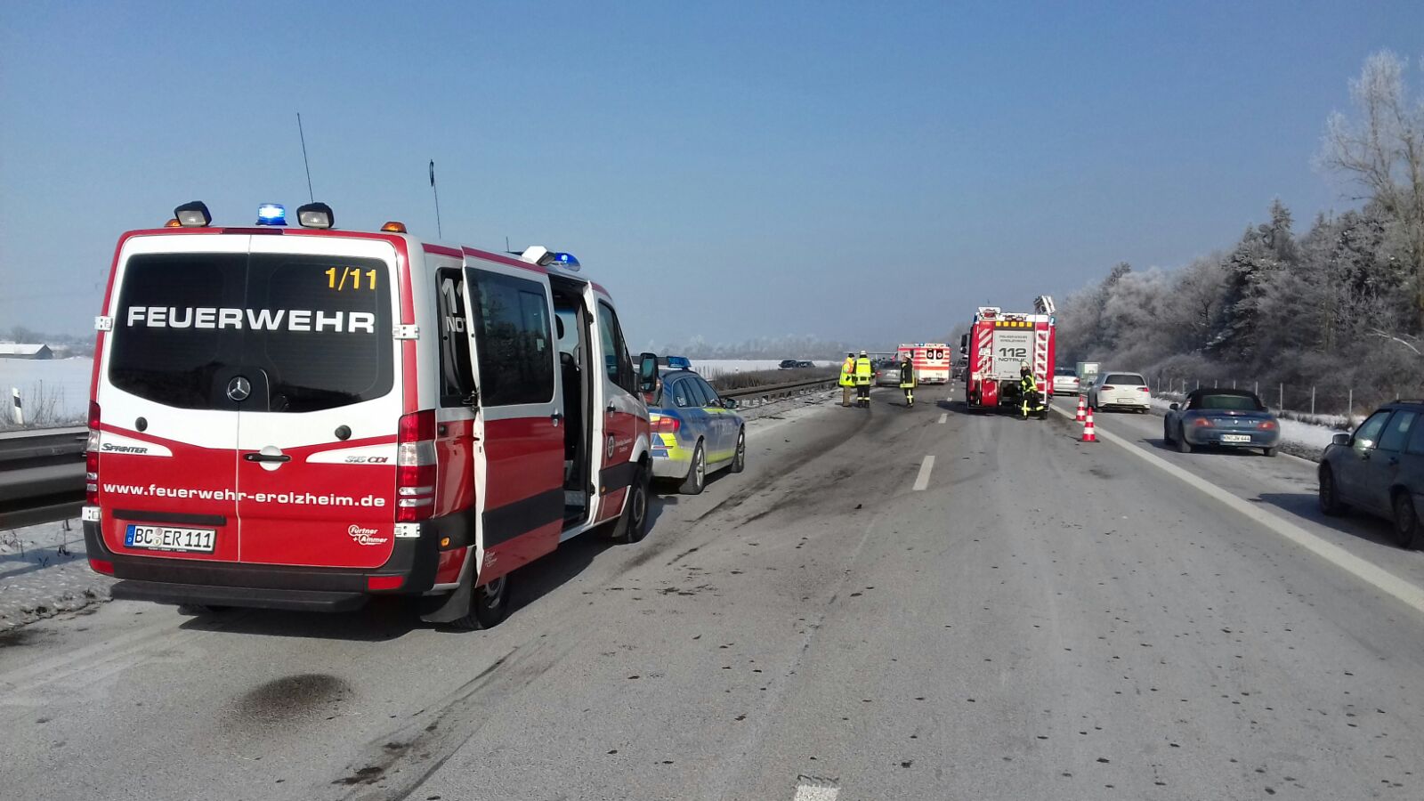 An der Einsatzstelle waren neben der Feuerwehr Erolzheim insgesamt 3 Rettungswagen von DRK und BRK sowie die Autobahnpolizei!