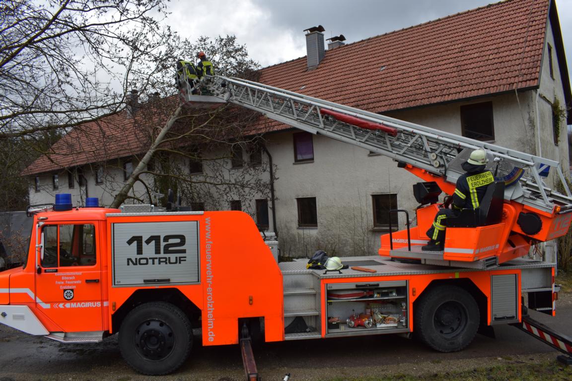 Am heutigen Sonntag Nachmittag wurden wir von der Feuerwehr Haslach mit unserer Drehleiter und dem Rüstwagen nachalarmiert. Im Gewerbegebiet in Haslach war aufgrund des anhaltenden Windes ein Baum auf ein Gebäude gestürzt. Wir entfernten den Baum stückweise mit einer Motorkettensäge und der Drehleiter. Nachdem die Gefahr beseitigt war und auf dem Dach die kaputten Dachplatten mit neuen ersetzt wurden, rückten wir wieder ein.