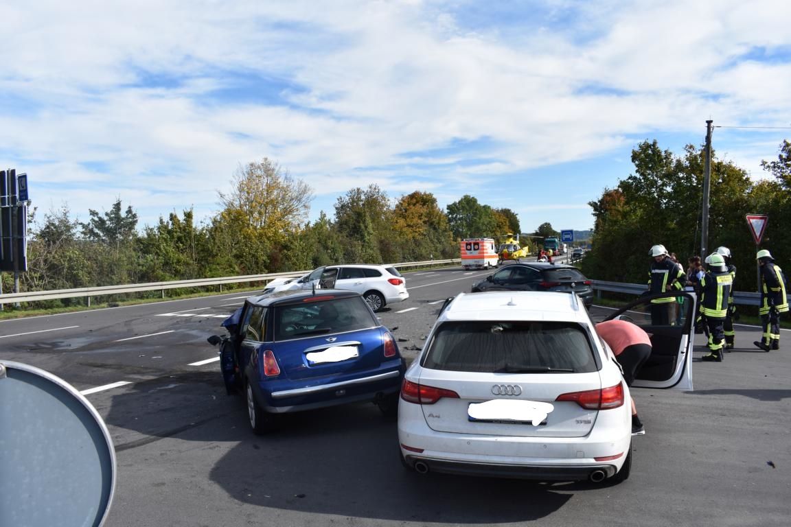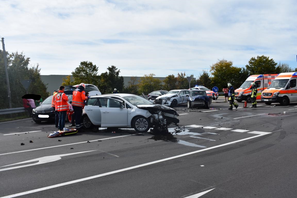 Gegen 12:05 Uhr befuhr der 67-jährige Unfallverursacher die Bundesstraße 312 von Memmingen her kommend in Fahrtrichtung Ochsenhausen. Auf Höhe Berkheim wollte er nach links abbiegen. Dabei übersah er jedoch einen 27-jährigen Mini Fahrer und missachtete dessen Vorrang. Im Kreuzungsbereich kam es zum Frontalzusammenstoß. Durch den Aufprall wurde der Astra des 67-Jährigen zurück auf den Abbiegestreifen geschleudert. Der Mini des 27-Jährigen wurde nach rechts abgewiesen. Er schleuderte mit voller Wucht gegen den Audi eines 26-Jährigen. Dieser stand an der Einmündung zur Bundesstraße 312 und wollte nach Ochsenhausen fahren. Durch umherfliegende Trümmerteile wurde zudem der Opel einer 62-Jährigen beschädigt. Sowohl der Unfallverursacher, seine 61-jährge Beifahrerin als auch die beiden jungen Männer wurden schwer verletzt. Sie kamen zur stationären Behandlung in Krankenhäuser. Zu ihrer Versorgung waren vier Rettungswagen, ein Notarzt und der Rettungshubschrauber im Einsatz. Der Sachschaden wird derzeit auf insgesamt etwa 37.000 Euro geschätzt. Mit Ausnahme des Opels der 62-Jährigen mussten alle Fahrzeuge abgeschleppt werden. Das Verkehrskommissariat Laupheim nahm den Unfall auf.
