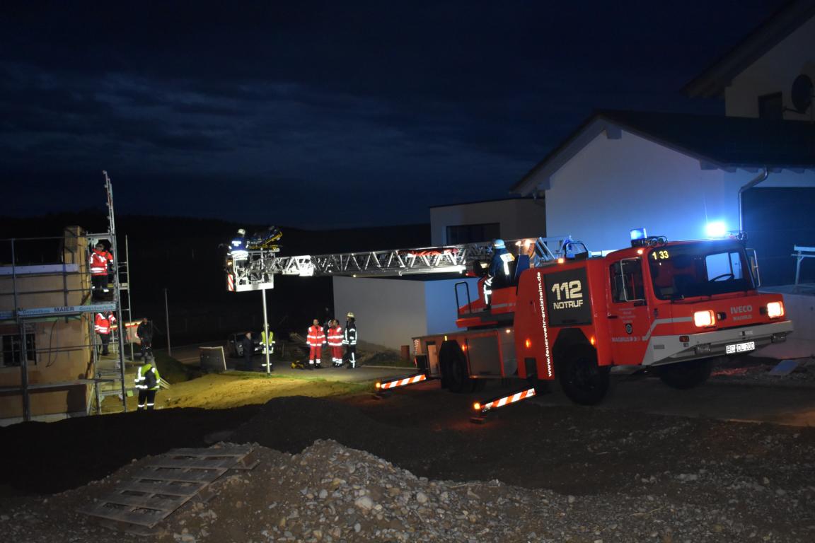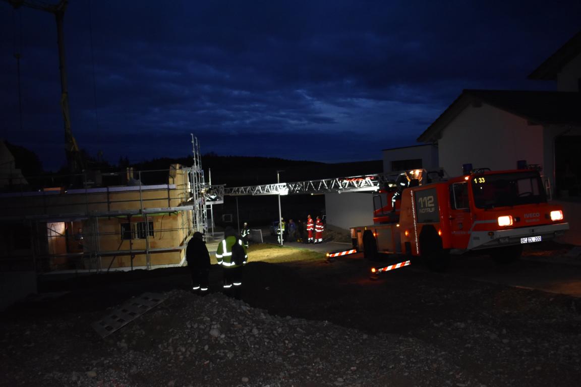 Zum zweiten Einsatz des heutigen Tages alarmierte uns die Integrierte Leitstelle Biberach zu einer Personenrettung in ein Baugebiet im Ortsbereich. Bei Mauerarbeiten war eine Arbeiter von einer Plattform im ersten Obergeschoss eines Neubaus gefallen und hatte sich eine Beinverletzung zugezogen. Da in diesem Gebäude noch keine Treppe vorhanden ist, forderte der Rettungsdienst die Unterstützung der Feuerwehr an.