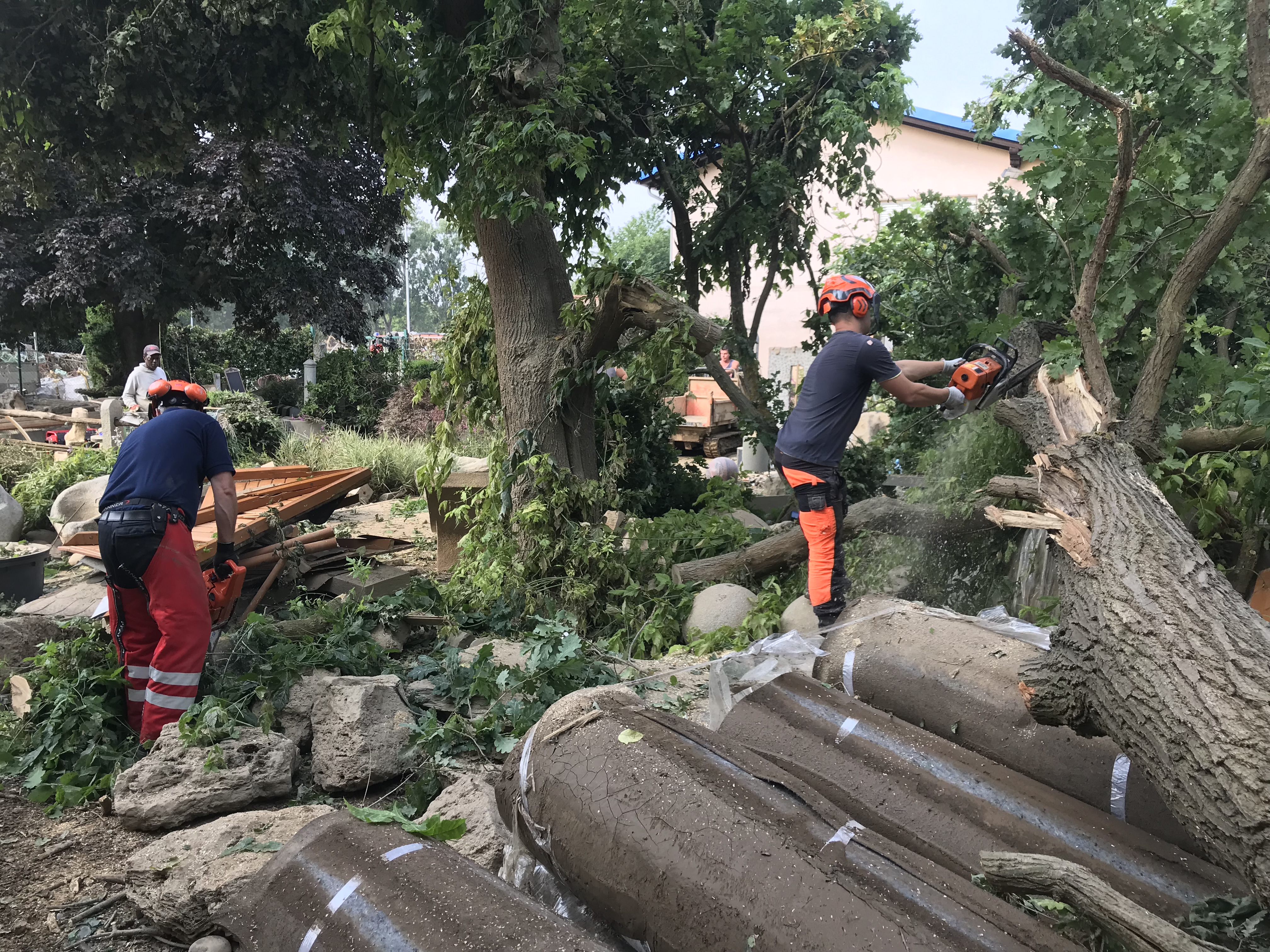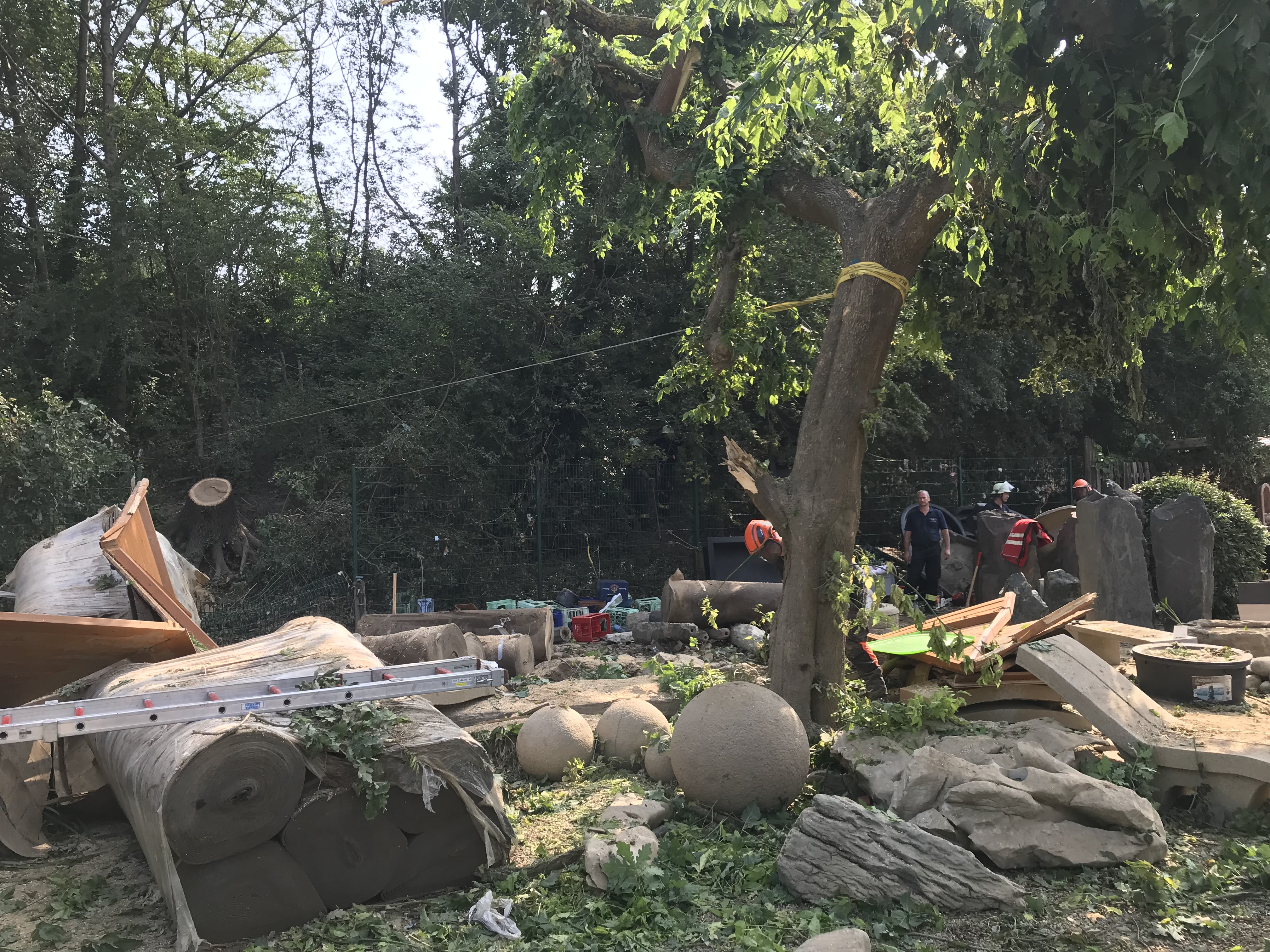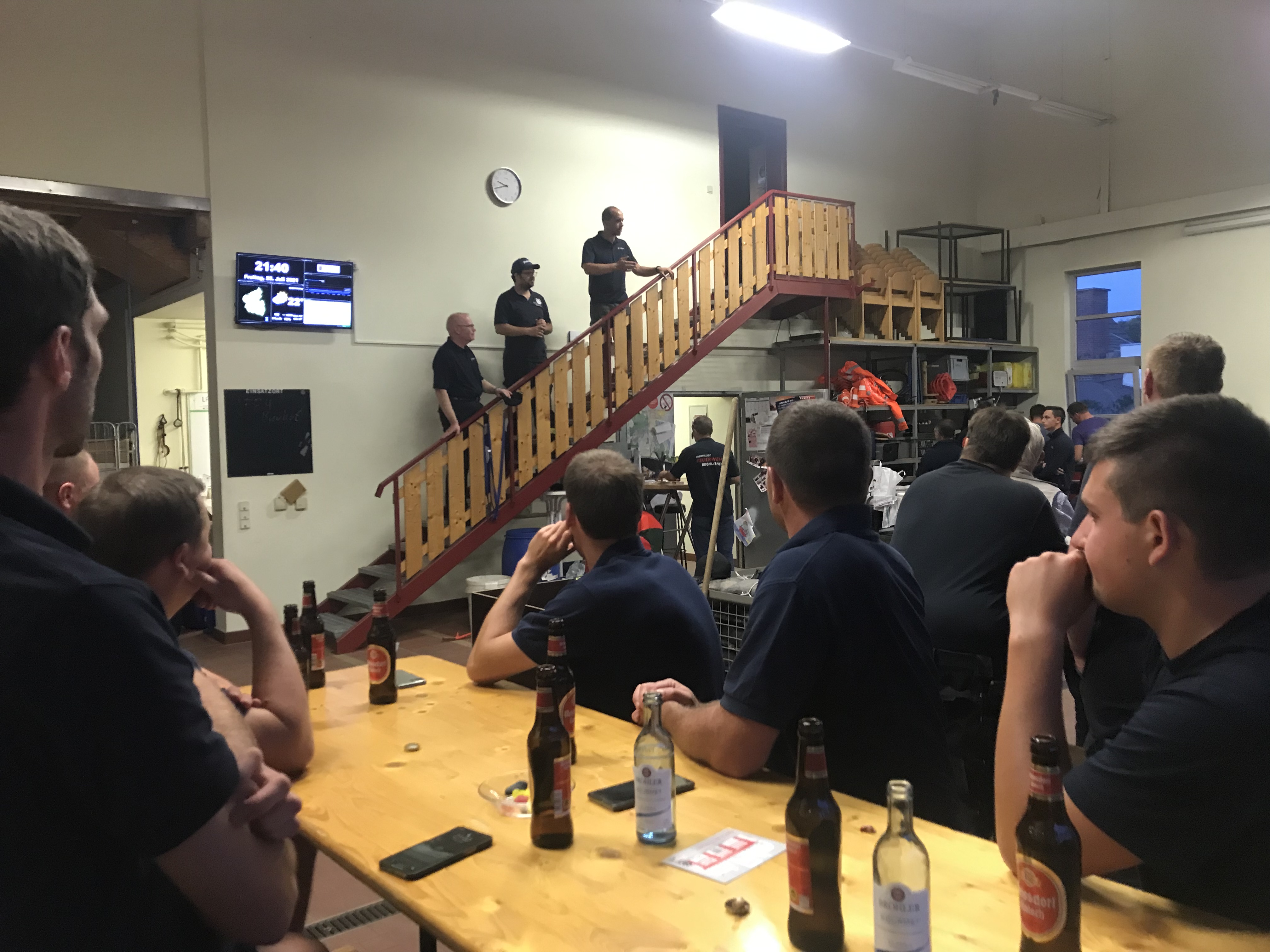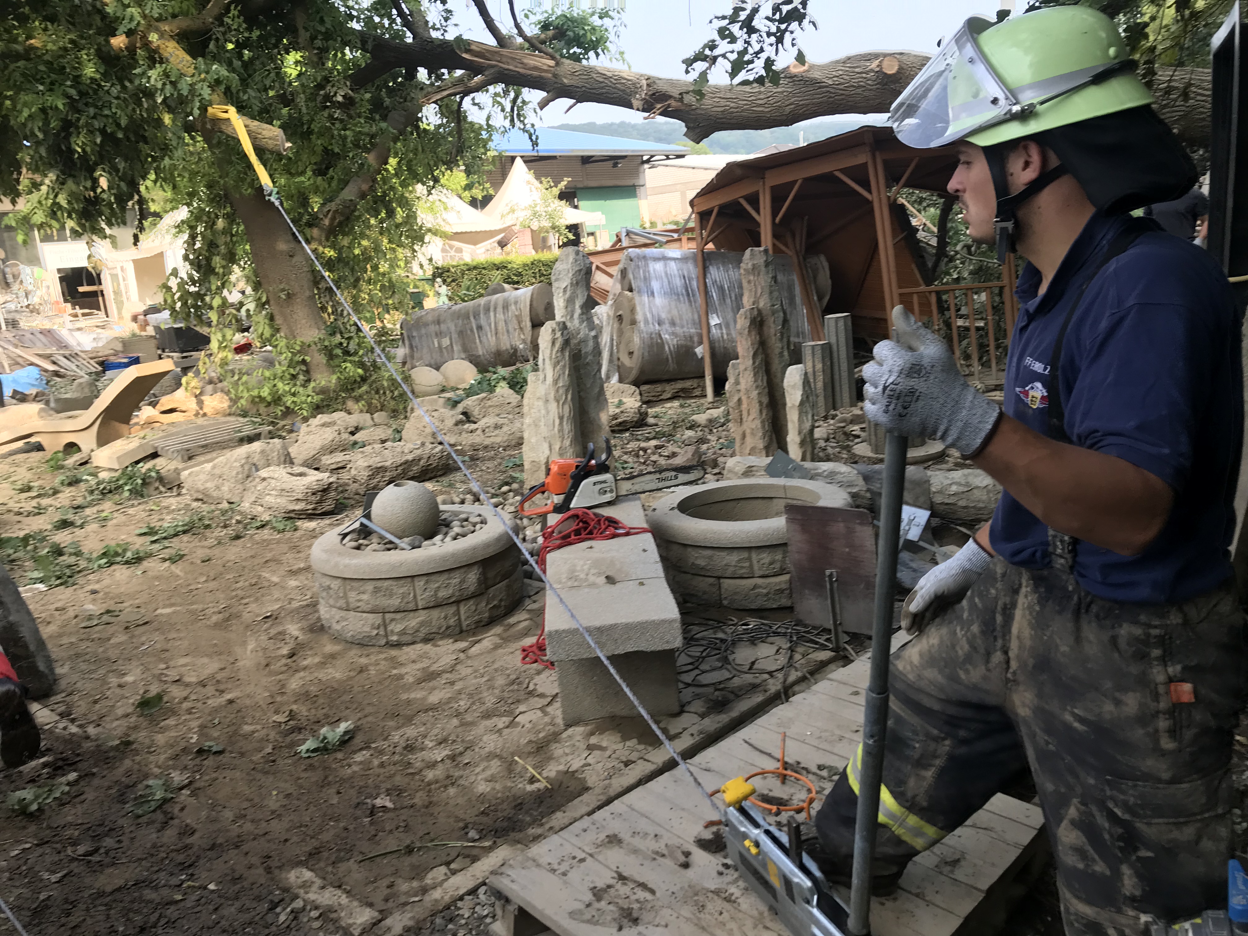 Der nächste Tag war aufgrund unseres Rüstwagens sehr technikbezogen. Wir führten Baumfällarbeiten aufgrund der Gefahr des Umstürzens mit der Motorsäge sowie des Mehrzeckzuges durch, übernahmen das Führen von Beförderungsmitteln und schafften einen Zugang durch eine Außenwand in einer Sporthalle, sodass hier Bagger einfahren konnten . Natürlich wurde auch weiterhin die Bevölkerung bei den Aufräumarbeiten unterstützt . Mit an der Einsatzstelle waren Kräfte der Feuerwehr Ravensburg. Danke für die gute Zusammenarbeit. Abends wurden wir wie am Vortag hervorragend von der Feuerwehr Brohl/Rhein versorgt. Hier wurde kameradschaftlich bis zum späten Abend zusammengesessen .