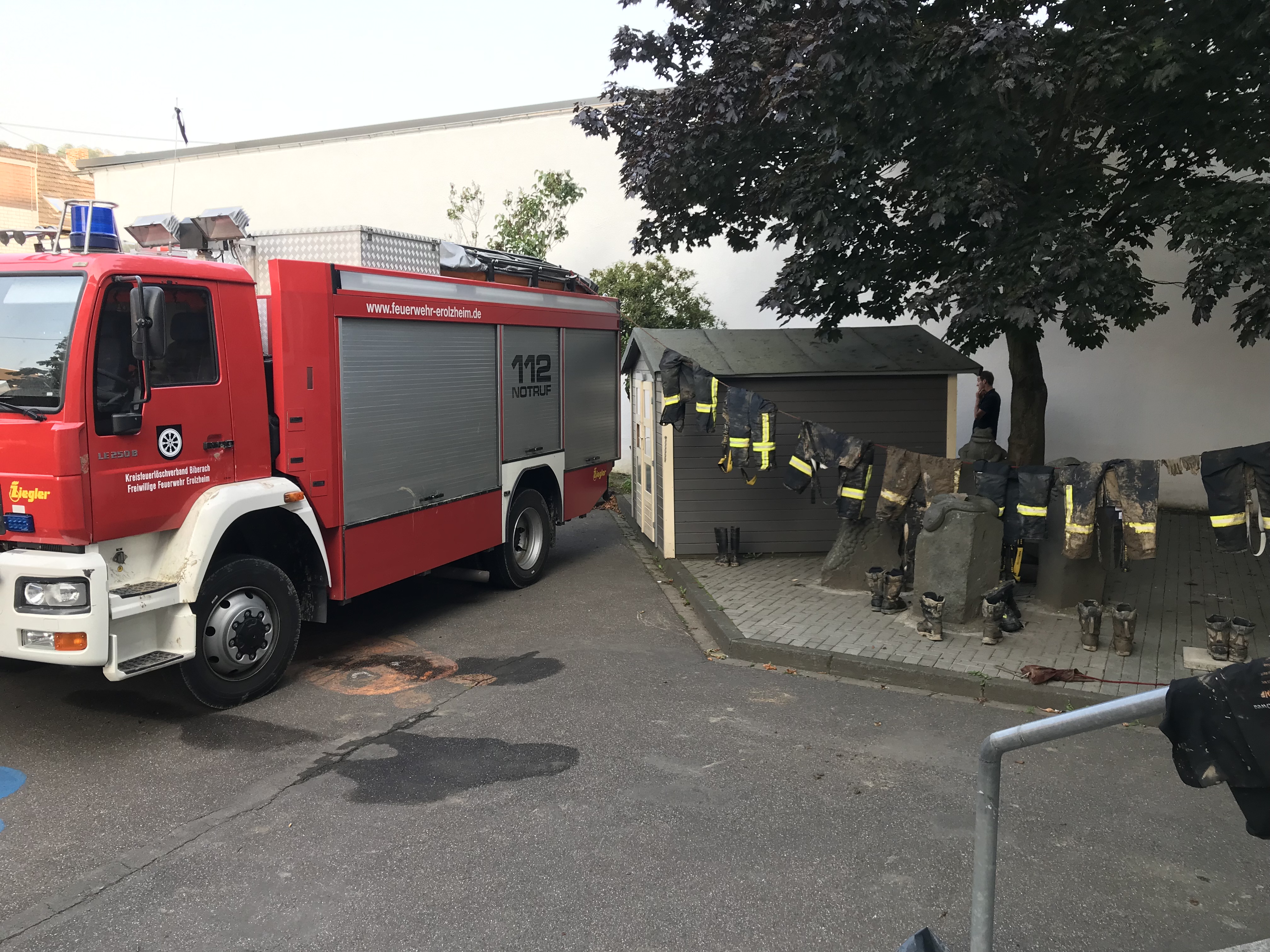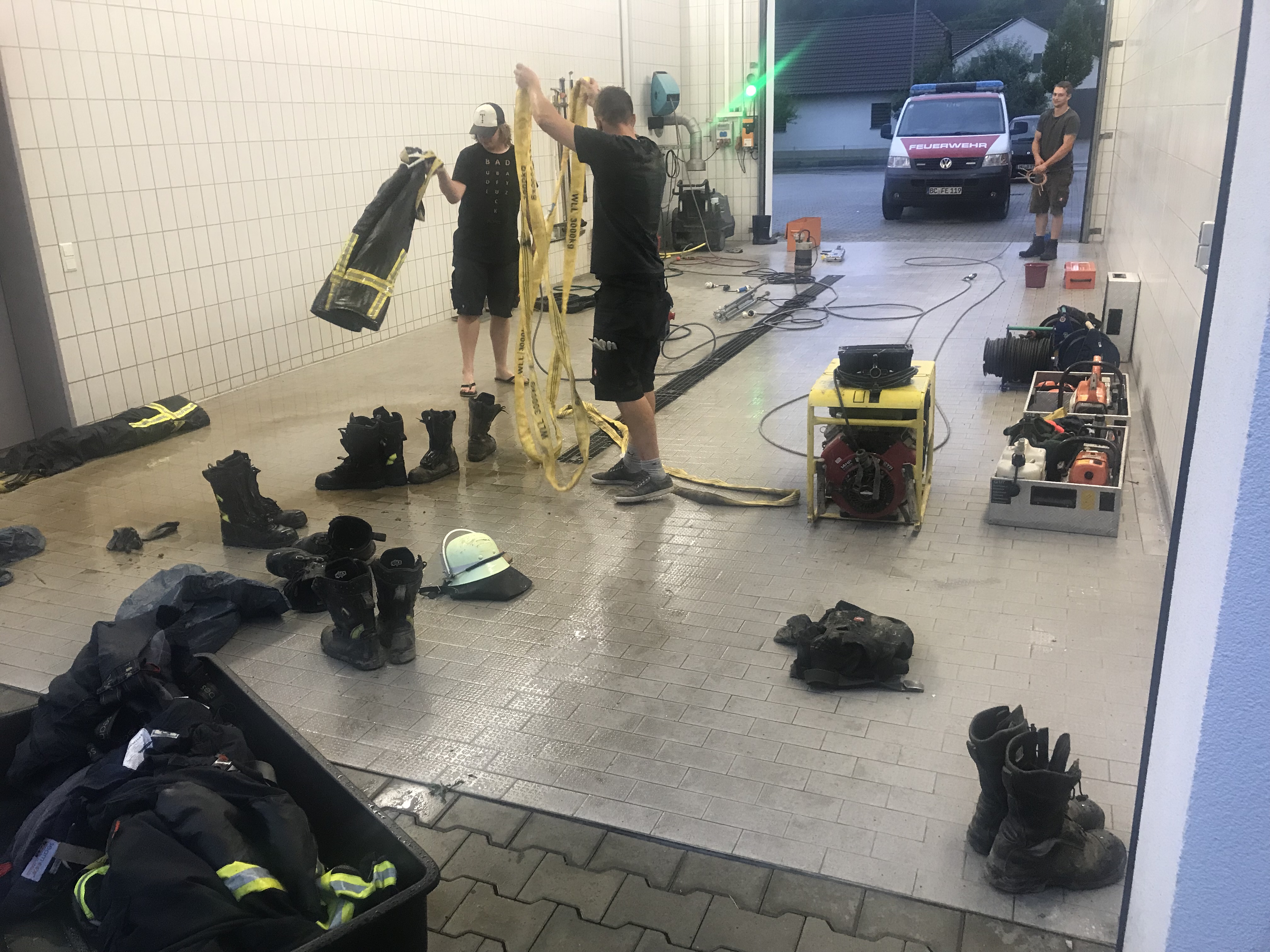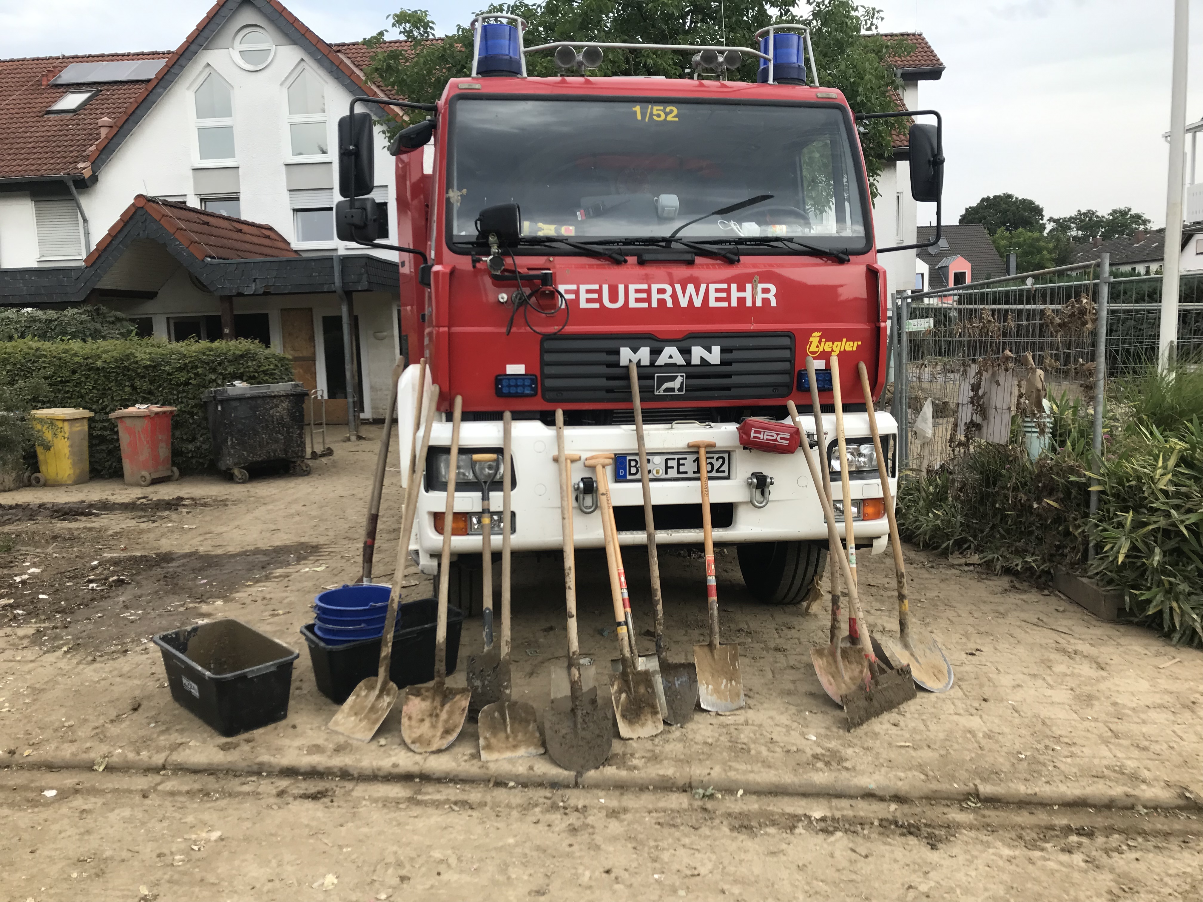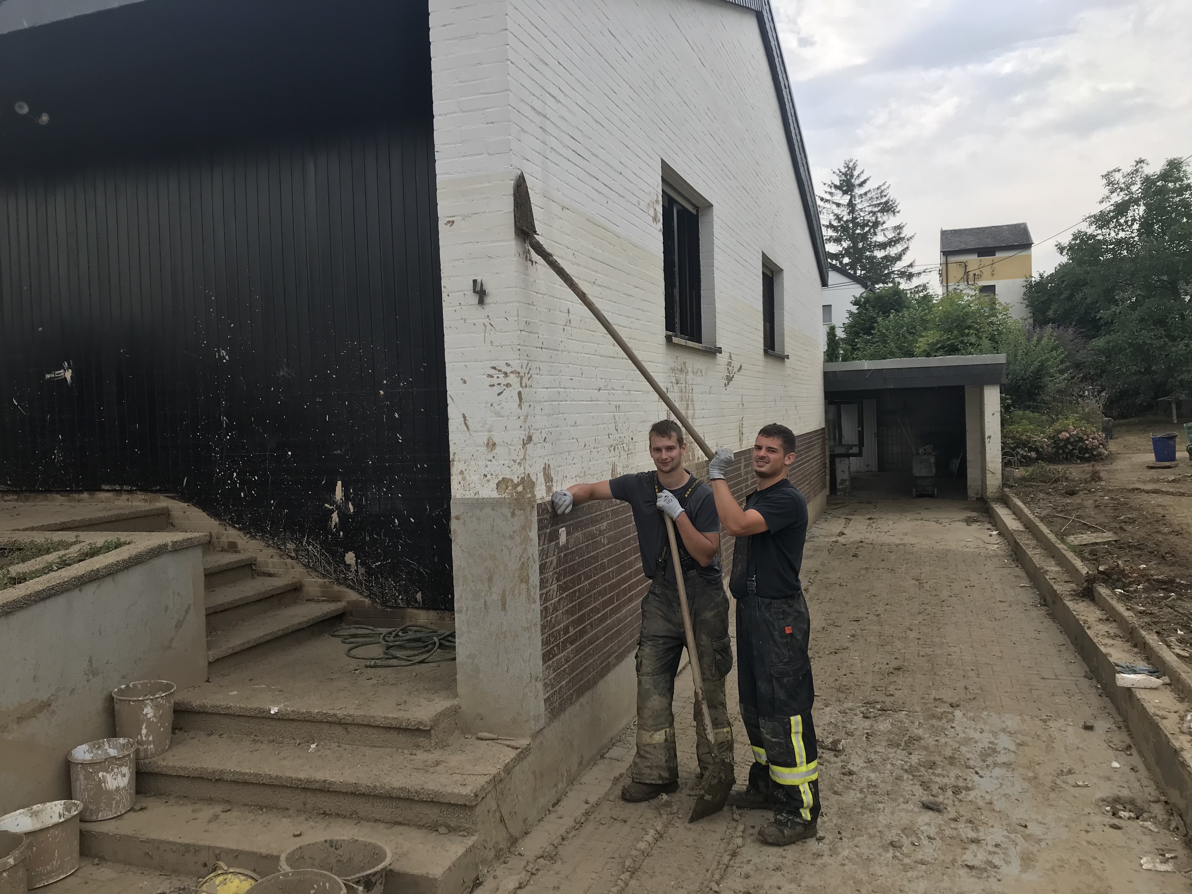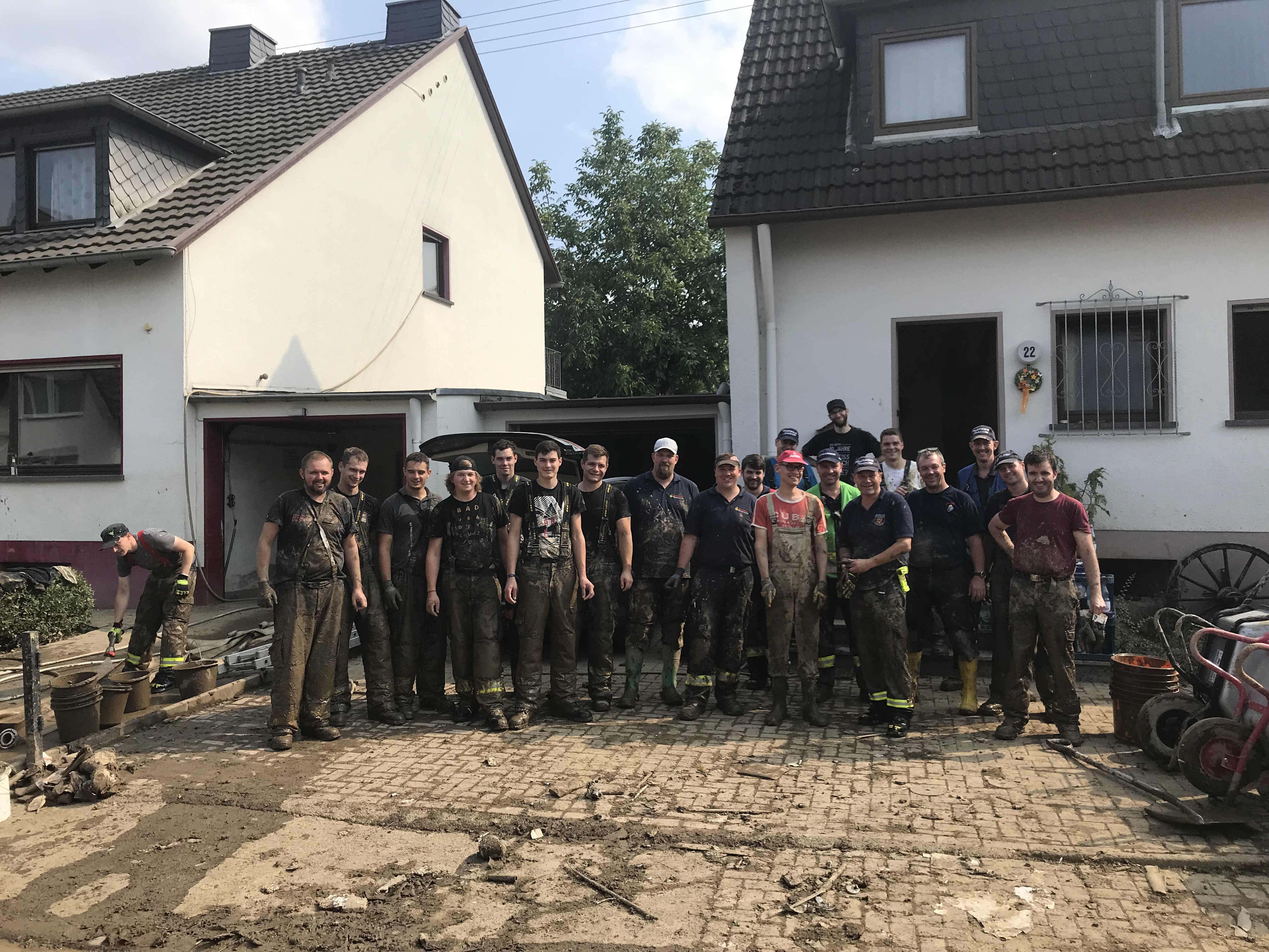 Am ersten Tag kamen wir in ein Gebiet, das noch keine fremde Hilfe bekommen hatte . Wir unterstützen die örtlichen Kräfte bei den Aufräumarbeiten, die durch den teils Kniehohen Schlamm nach gewisser Zeit recht mühselig wurde. Abends wurde der Verband aufgeteilt. Wir kamen zusammen mit der Führung aus Ulm sowie dem Zug aus Sigmaringen bei der Feuerwehr Brohl/Rhein unter .