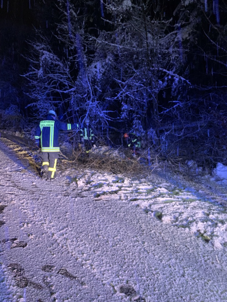 Am Ortsausgang Erolzheim in Richtung Bechtenrot kam es zu einem Schneebruch. Ein umgestürzter Baum blockierte den Radweg und teilweise die Fahrbahn. Von uns wurde der Baum aufgesägt und auf die Seite geräumt. Anschließend wurde noch der restliche Streckenabschnitt kontrolliert.