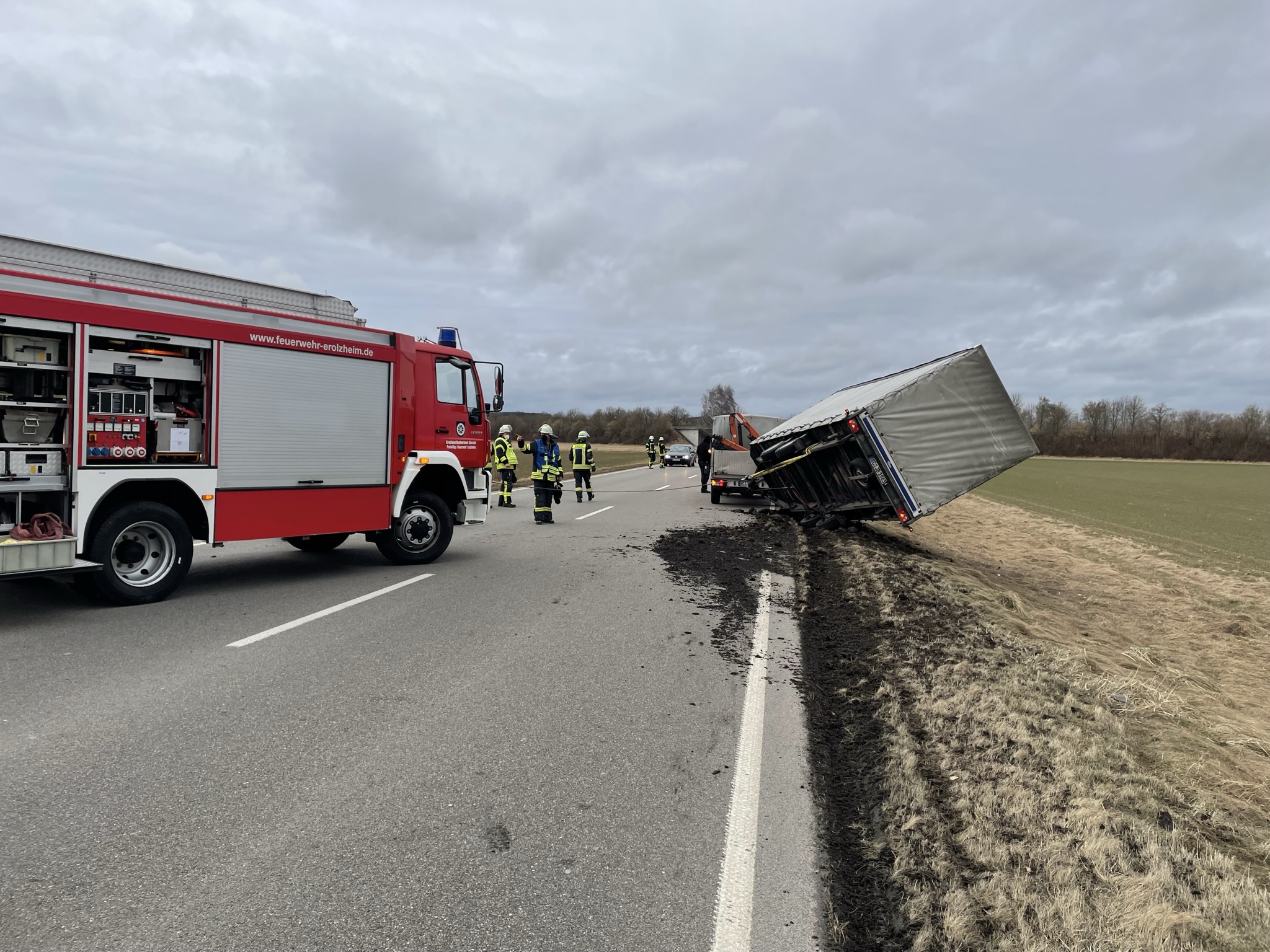 Wir sperrten die Bundesstraße, sicherten den Anhänger mit unserem Rüstwagen und stellten diesen wieder auf die Straße. Anschließend wurden die Seitenplanen des Anhängers geöffnet um dem Wind keine weitere Angriffsfläche zu bieten.