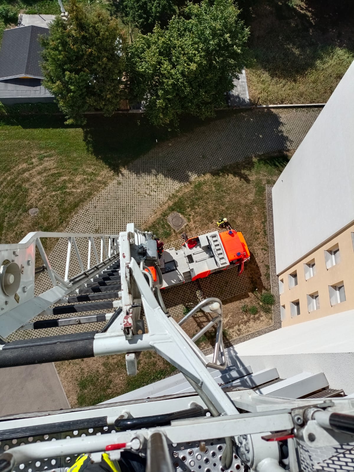 Da dies über das Treppenhaus des Hochhhauses nicht möglich war, kam hier die Drehleiter zum Einsatz.